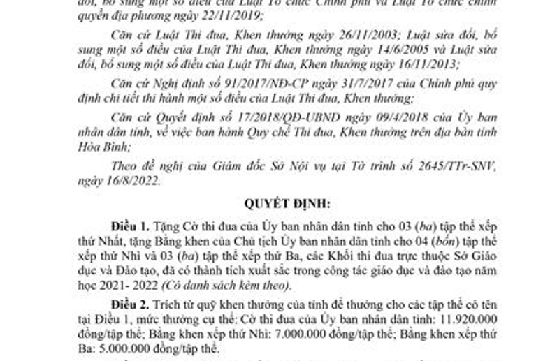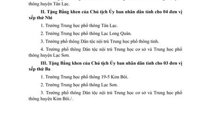 Ngoài ra, năm học 2020 - 2021 được UBND tỉnh tặng Bằng khen cho đơn vị xếp thứ 2 khối thi đua theo QĐ số 1611/QĐ-UBND ngày 02/8/2021 của Chủ tịch UBND tỉnh Hòa Bình