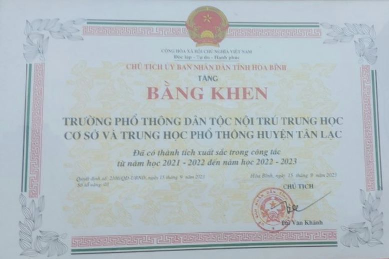 Sáng ngày 09/01/2023, trường PT DTNT THCS&THPT huyện Tân Lạc đã vinh dự được Chủ tịch UBND tỉnh Hòa Bình tặng Bằng khen đã có thành tích xuất sắc trong công tác từ năm học 2021 - 2022 đến năm học 2022 - 2023.