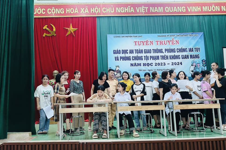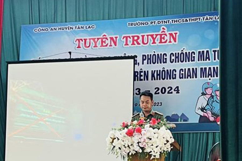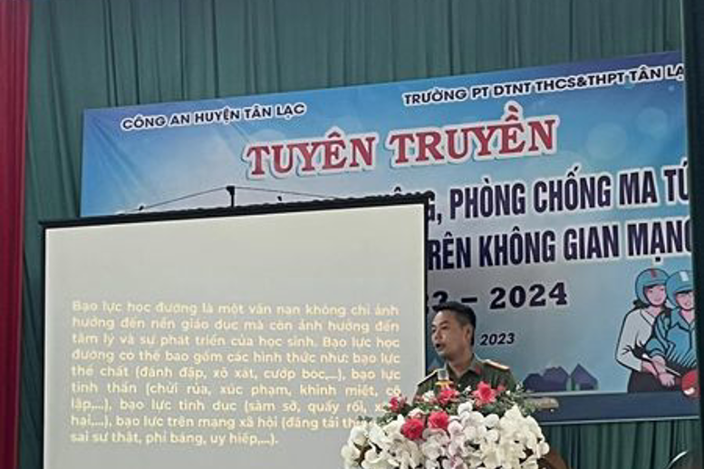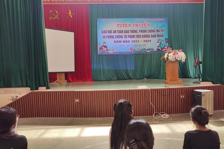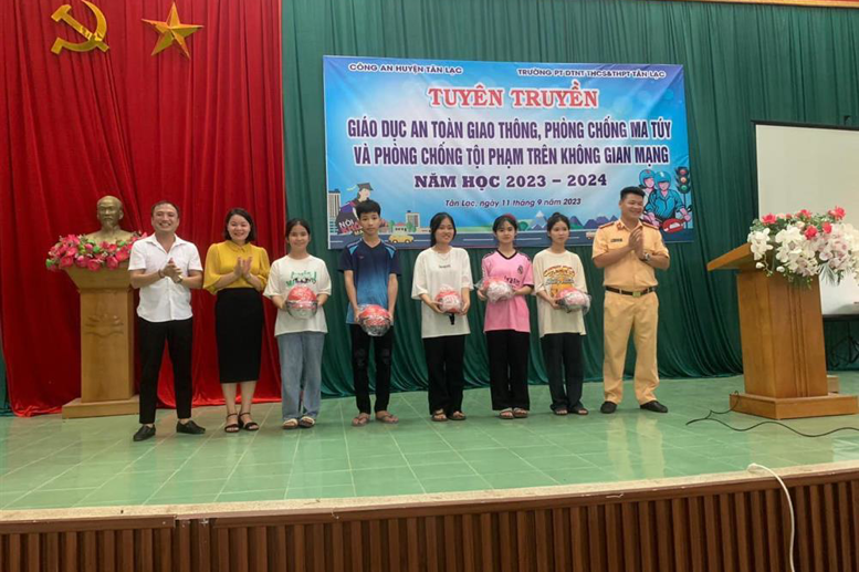 Thực hiện kế hoạch đảm bảo an toàn, an ninh trường học, chiều ngày 11/9/2023, Trường PT DTNT THCS&THPT huyện Tân Lạc phối hợp với Công an huyện Tân Lạc tuyên truyền giáo dục ATGT, phòng chống ma túy và phòng chống tội phạm trên không gian mạng.